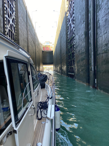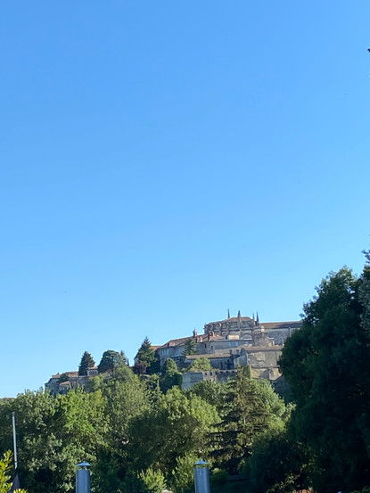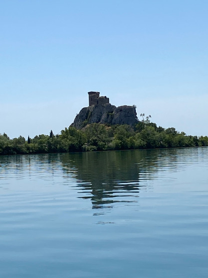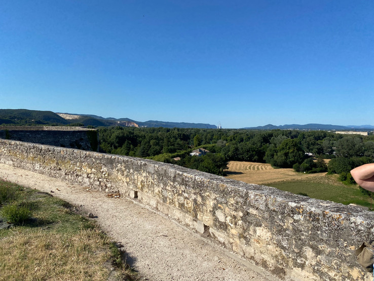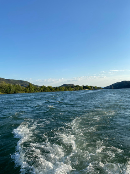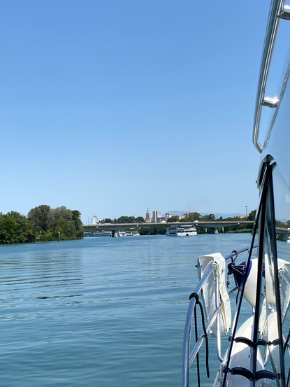 Am Sonntag um 6 Uhr klingelt der Wecker. Wir wollen heute weiter nach Avignon. Das sind ca. 75 km und 3 Schleusen. Nach den gestrigen Erfahrungen rechnen wir mit einer sehr langen Fahrt. Wir starten als ein Kreuzfahrtschiff in unsere Richtung die Hafeneinfahrt passiert. Das Kreuzfahrtschiff fährt schneller als wir, aber wir legen an den Schleusen einen Sprint ein und können mit einfahren. Dadurch verkürzen sich unsere Schleusenzeiten im Vergleich zu gestern erheblich. Die Landschaft ist ähnlich wie gestern, der Fluss wird noch breiter. Die Sonne knallt und wir erreichen 37 Grad. Richtung Avignon passieren wir die Weinberge Châteauneuf-du Pape. Wir sehen im Hintergrund die langen Reihen gepflegten Weines. Nahe dem Ufer passieren wir das Chateau Montfaucon und die Ruine des Chateau de l ´Hers. Immer noch im Schlepptau des Kreuzfahrtschiffes erreichen wir Avignon. Der Kreuzfahrer fährt seine Gäste bis vor die berühmte Pont St.-Bénezet - zum Fotoshoting. Wir nehmen Kontakt auf, da wir an die Liegestelle hinter der Brücke müssen und passieren dann steuerbord. An der Kaimauer werden wir von der, wie wir später erfahren, Mitarbeiterin der Capitainerie auf einen Platz an der Kaimauer herangewunken. Da die Strömung doch stärker als erwartet ist und der Wind sein übriges tut, brauchen wir etwas Anlauf. Beim Anlegen gibt es dann noch ein Missverständnis zwischen der Hafenmeisterin, Frank und mir, so daß wir mit der Badeplattform die Kaimauer touchieren. Franks Stimmung ist hin. Ich regle die Anmeldung mit der netten Hafenmeisterin. Sie erklärt mir, dass ab heute neue Coronaregeln gelten. Wir können die Duschen und WC des Anlegers nicht benutzen und können in den nächsten Tagen mit Maskenpflicht rechnen. Wir entscheiden uns, schnell mal eine Außendusche zu nehmen. Und bleiben vorerst an Bord.