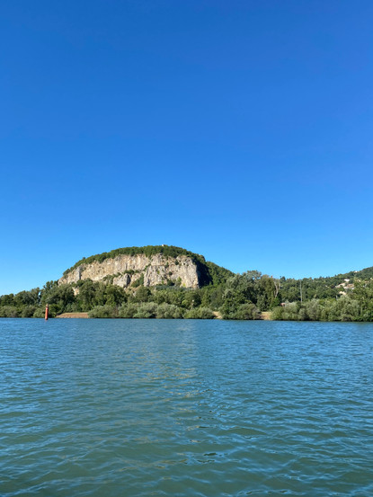 Nachdem wir einige Industriezonen passiert haben, reihen sich am rechten Rhôneufer die Weinberge aneinander. Die Orte werden zunehmend mediterraner. Auffällig ist der Ort Vienne. Von Weitem sieht man die Ruine des Chateau Batie auf dem Mont Salomon, auf dem der Erzbischof von Vienne Jean Bernin die Burg im 13. Jahrhundert errichten ließ. In Vienne gab es die erste Steinbrücke über die Rhône. Sie wird dem größten Baumeister des römischen Reiches, dem Kaiser Trajan zugesprochen. Sie blieb bis Mitte des 17. Jahrhunderts erhalten, bevor sie dann endgültig einstürzte. Heute befindet sich an der Stelle eine Hängebrücke, die als Fußgängerbrücke genutzt wird.