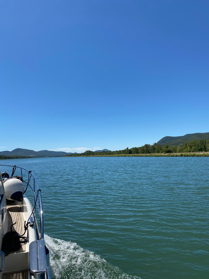 Am Donnerstag setzen wir unsere Fahrt auf der Rhone fort. Es weht ein frischer Wind aus Süd. Unterwegs kennzeichnen wir uns kleine Anlegestellen in unserer Karte, die wir ggf. auf dem Rückweg anlaufen. Wir halten aktuell die Abschnitte größer, da wir in Avignon eine Motordurchsicht verabredet haben. Dennoch erwägen wir in Adancette anzulegen. Hier kann nur ein Boot liegen. Man könnte einen Ausflug in die Weinberge zu einer Destillerie machen. Allerdings ist für heute Nachmittag Gewitter angesagt und wir befürchten den Rückweg nicht zu schaffen. Zum Glück fahren wir weiter, denn der Wind wird immer heftiger. Auf der Rhone baut sich eine Welle von gut einem Meter auf. Die Berge werden steiler und Weinbau sehen wir nur noch auf Hochebenen. Dafür gibt es an den Felsen des rechten Rhôneufers diverse riesige Steinbrüche. Gegen 16:30 Uhr erreichen wir Valence. Das Anlegemanöver ist eine echte Herausforderung. Der starke Wind lässt Bug- und Heckstrahlruder alt aussehen. Aber Frank kommt am Ende mit kräftigem Rückwärtsschub auf den Liegeplatz und wir können das Boot fest machen. Der Hafen hat Platz für mehr als 400 Boote und ist bestens ausgestattet. Er liegt außerhalb von Valence geschützt, abseits der Strömung. Der Wind ist natürlich trotzdem da, nur die Welle nicht. Wir machen schnell Bekanntschaft mit einem Deutschen Dauerlieger, mit einem im Belgien zugelassenen Stahlschiff, der in Linz lebt. Mit viel Herzblut legt er uns die Stadt und die Region ans Herz und gibt uns auch viele Tipps für unsere Weiterreise. Wir verbringen einen netten gemeinsamen Abend. Spät kommt noch ein Deutsches Boot, eine NC 11 in den Hafen. Der Wind bläst unbändig und auch sie müssen waghalsige Manöver fahren, um anzulegen. In einem unübersichtlichen Wendemanöver gibt es eine Kollision mit einem nachfolgenden kleinen Motorboot. Die Persenning des Bootes bekommt etwas ab, aber es scheint nichts Schlimmeres passiert zu sein, denn das kleine Motorboot setzt zügig seinen Weg fort und der NC11 gelingt es anzulegen. Wir gehen schlafen und ich habe für mich schon klar, dass ich einen Tag bleiben möchte.