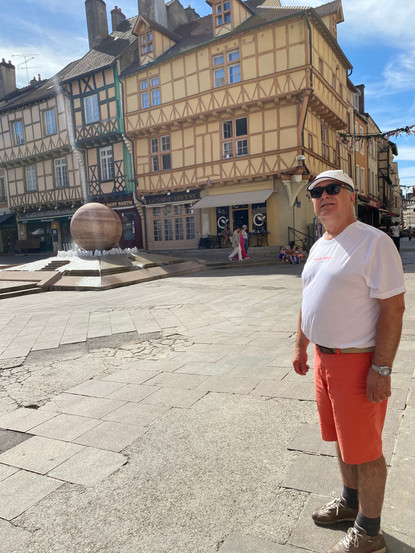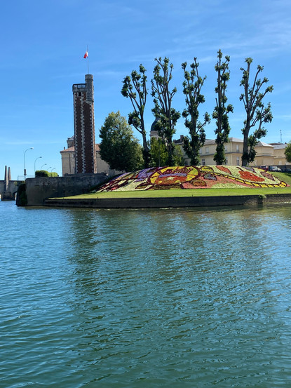 Am Dienstag machen wir uns auf den Weg nach Chalon-sur-Saône. 24 km sind eigentlich ein Katzensprung, aber wir wollen uns das Städtchen nicht entgehen lassen. Die Saône hat ein ganz eigenes Flair. Wir konnten keinen Vergleich zu einem der uns bekannten Flüsse finden. Die Ufer sind grün, es gibt keine Buhnen und man kann in das Land hineinschauen, auf landwirtschaftliche Flächen, Wiesen und kleine hübsche Orte. Überall an den schattigen Ufern sitzen Angler mit großer Ausrüstung, Zelt und Grill, manchmal mit Kind und Kegel, und angeln, was das Zeug hält. Manchmal sehen wir pro Standort 6 Angeln. Es fährt sich sehr angenehm. Bei dem aktuellen Wasserstand haben wir eine gemächliche Strömung und heute erwarten uns keine Schleusen. Die Einfahrt nach Chalon-sur-Saône ist schon sehr hübsch. Vor der Altstadt gibt es Tagesliegeplätze. Wir fahren in den Port de Plaisance der auf den ersten Blick viele Liegeplätzen bietet. Wir werden von einer jungen Mitarbeiterin der Capitainerie im Matrosenlook abgefangen. Die Liegeplätze im Hafenbecken sind Dauerliegern oder länger Liegenden vorbehalten. Wir werden an den Außensteg verwiesen und machen fest. Vor uns ist ein Boot angekommen, welches ebenfalls mit uns in Verdun-sur-le-Doubs gelegen hat. Später treffen auch die Nachbarn ein, die einen der letzten Plätze bekommen. Wir liegen gut und der Hafen bietet alles, was man braucht. Wir bekommen einen Stadtplan und auch eine Liste mit Sehenswürdigkeiten mit Erklärungen in Deutsch. Nach der Mittagspause machen wir uns auf den Weg. Wir gehen über eine Fußgängerbrücke hinüber zur Saint-Laurent- Insel. Auf dieser Insel gab es im 16. Jahrhundert ein Hospital und ein Franziskanerkloster, welches auf Veranlassung des Herzogs von Burgund Philipp dem Guten bereits 1450 gegründet wurde. Heute ist hier der Sitz der 43. Companie der Staatspolizei. In der Hauptstraße der Insel finden wir ein Restaurant am anderen, welches sich auf die abendlichen Gäste vorbereitet. Darüber hinaus entdecken wir einen Weinkeller, der diverse interessante Weine verspricht. Über die Brücke Saint-Laurant gelangen wir in die Altstadt von Chalon-sur- Saône. Wir nehmen den Weg Orbandale als Orientierung für unseren Stadtbummel. Der Name des Rundweges bezieht sich auf den mittelalterlichen, poetischen Namen der Stadt. Einem Historiker aus dem 17. Jahrhundert zu folge liegen dem Namen drei goldene Kreise zugrunde (orbes auf Altfranzösisch), die das Wappen einrahmen, symbolisch für die drei Reihen vergoldeter Backsteine auf den alten Mauern, die die Stadt einschlossen.
