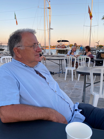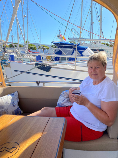 Auf dem Rückweg lässt Franks Reifen wieder Luft, so dass wir froh sind, noch ohne ganz platten Reifen zurück zum Hafen zu kommen. Der Hafenmeister unterstützt wieder und flickt den Reifen. Wir verstauen die Räder wieder an Bord. Am Abend schallt vom Kai Musik herüber. Eigentlich wollen wir navigieren, aber die Stimmung ist einladend und wir schauen was los ist. Am Kai sind eine Reihe von Buden aufgebaut, bei denen man von Pizza über Burger, Muscheln, gegrillten Fisch, Getränke, Eis alles zu erschwinglichen Preisen bekommen kann. Lange Tischreihen sind aufgebaut und man trifft sich hier mit Kind und Kegel. Auch wenn es schon auf 21 Uhr zu geht, sind Kleinkinder dabei. Sie gehören einfach dazu. Zwei Musiker singen französische, spanische, italienische und englische bekannte Lieder und das Publikum summt mit und lässt es sich gut gehen. Wir nehmen etwas zu trinken und genießen die Stimmung. Später werden wir von einem Franzosen am Nachbartisch angesprochen und setzen uns zu ihm und seiner Frau. Irgendwann stellt sich heraus, dass es der Mitarbeiter der Tourismusinformation ist. Wir müssen lachen. Ihm entschlüpft ein „Pardon“ und wir haben das Gefühl, er ist sich der Situation von vorher bewusst. Egal und vergessen. Der Abend ist schön. Ein stimmungsvoller Abschluss bevor wir aufs Meer gehen. Heute lässt der Wind uns auch schlafen.