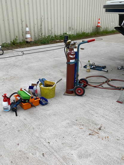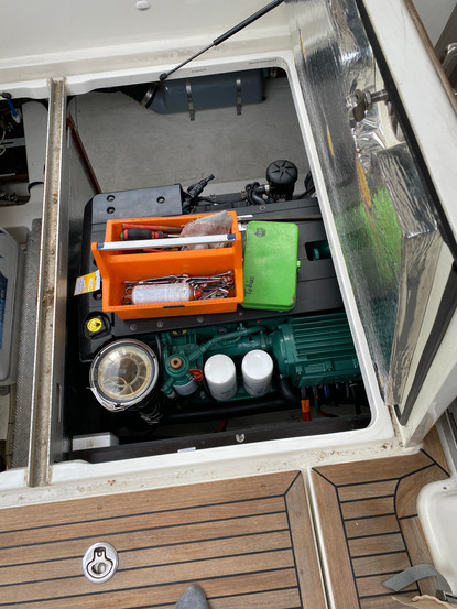 Am Freitag nach Himmelfahrt ist die Stopfbuchse tatsächlich da. Das Boot wird gleich am Morgen geslippt. Und dann geht es los. Remi und Tobi leisten Schwerstarbeit. 2 Männer sind bis zum späten Nachmittag beschäftigt. Am Schwersten ist es, die Welle raus zu bekommen. Die Verbindung zum Getriebe ist konisch und kann nur mit Schrauben weggedrückt werden. Oftmals muss ein Fäustel her und manches Teil muss zum Lösen erwärmt werden. Am Ende ist alles wieder dicht. Unser Boot schwimmt am Abend wieder.
