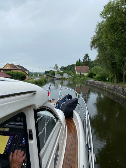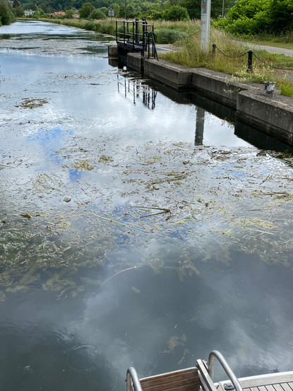 Das bestätigt sich auch. Die ersten drei Schleusen regnet es. Die Landschaft ist sehr schön. Wir fahren geraume Zeit parallel zum Doubs. Das Schleusen flutscht ganz gut heute und auch der Regen hört auf. Probleme machen die Algen im Fluss. Es ist so schlimm, dass wir teilweise keine Tiefen mehr angezeigt bekommen. Eine Schleuse blockiert wegen des Drecks, so dass wir nach Anruf des VNF wieder eine dreiviertel Stunde warten müssen. Nachdem wir uns dann mühselig mit geringen Geschwindigkeiten durch den Dreck geschoben haben, gibt der Motor Alarm wegen überhitzter Abgase. Das veranlasst uns nach Schleuse 24 am Ponton anzulegen und nicht weiter zur Isle sur le Doubs zu fahren, wo eventuell ein bequemer Anleger auf uns gewartet hätte. Aber so passt es auch. Wir machen es uns gemütlich, kochen und chillen. Immer wieder kommen heftige Gewittergüsse. Beim Stärksten Regen - oh Wunder - schleust doch tatsächlich ein weiteres Boot zu Tal. Es hat sie voll erwischt. Als wir hier so liegen, werden wir von Gegenüber von einem Schwarzwälder in Cowboykluft angesprochen. Sachen gibt es. Er, seine Frau und deren 29-jähriger Sohn sind mit 2 Pferden auf dem Weg nach Barcelona. Dort wollen sie im Herbst sein. Wie lange sie hierbleiben, wissen sie nicht. Die Eltern sind um die 70 und er hat verletzte Beine, so dass er reitet. Frau und Sohn wandern. Ein Kaltblüter trägt das Gepäck. Das ist allerdings eher dürftig, denn sie übernachten unter einer Plane.