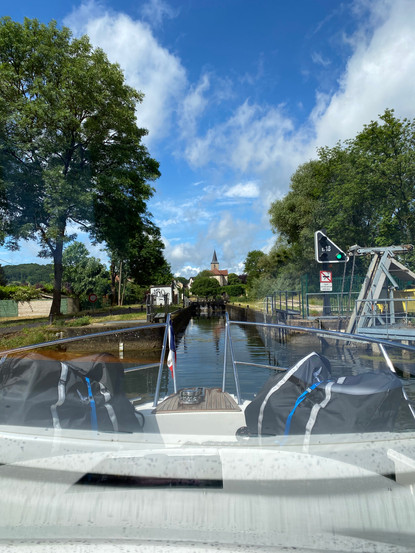 Unser Ziel für den heutigen Samstag ist Montbéliard. Bis dorthin sind es nur 20 Kilometer. Wir schleusen erstmalig alleine zu Tal und bewältigen 10 Schleusen. Dabei haben wir ein gutes System gefunden. Nach Einfahrt in die Schleuse mache ich zunächst am Heck fest und lege dann die Bugleine über den Festmacher. Je nach Lage reicht Frank die Leine an. Nachdem ich die Schleusung in Gang gesetzt habe, bedient Frank die Heckleine und ich die Bugleine. Wenn das Schleusentor aufgeht, ziehe ich die Bugleine und übernehme die Heckleine. Nach Ziehen der Heckleine fahren wir aus der Schleuse. Leider müssen wir heute wegen defekter Schleusen 2-mal länger vor der Schleuse warten, davon einmal eine ganze Stunde. Hier ist offensichtlich ein Boot aus dem Unterwasser in unseren Schleusenvorgang hineingefahren und hat das System durcheinandergebracht. Ich rufe jeweils VNF an, die in der Regel nach einer halben Stunde vor Ort sind. Nach 7 Stunden Fahrt sind wir endlich in Montbéliard und ganz schön k.o. Das liegt auch an der schwülen Wärme, die uns schon den ganzen Tag begleitet. Wir haben mindestens 28 Grad und es liegt Gewitter in der Luft.