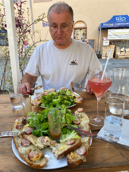 Montbéliard liegt am Fuße des Schlosshügels. Hier befand sich ursprünglich eine römische Befestigungsanlage. Heute erhebt sich das imposante Schloss von Henriette von Württemberg über der Stadt. Wir gehen die steilen Gassen zum Schloss, können aber leider nicht in die Ausstellung. Henriette war Erbin einer alten französischen Familie, die durch Heirat ihr Schicksal und das der Stadt mit dem Deutschen Reich verband. Montbéliard war somit 400 Jahre lang ein deutsches Fürstentum auf französischem Boden. Erst im Jahr 1793 wurde es von Frankreich annektiert. Bevor wir zum Schloss hinauf gehen, mischen wir uns unter die Leute und nehmen einen Drink in einem der vielen Restaurants. Nach unserem Stadtbummel wollen wir gerne Essen gehen. Aber für französische Verhältnisse sind wir zu früh dran. Die Speiserestaurants öffnen19:00 Uhr. In einer Nebenstraße animiert uns jemand, der gerade Tische vorbereitet,“Chez Maurice“ zu speisen, was wir dann auch machen.