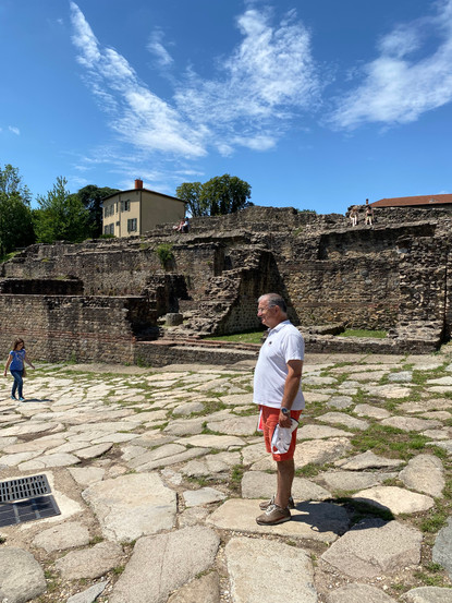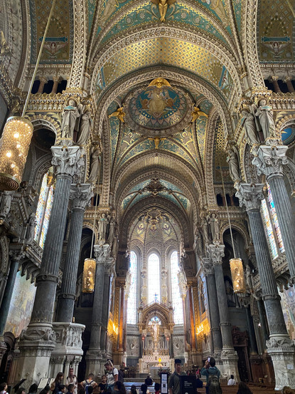 Eine Woche nach unserer Ankunft in Lyon wollen wir nun, heute am Dienstag, einen Teil der Stadt anschauen. Dazu fahren wir zunächst mit Tram und U-Bahn zum Place Bellecour und gehen in die Touristinfo. Wir bekommen einen Plan und lassen uns bestätigen, was wir schon wissen. Wir sehen uns die Basilika Notre-Dame de Fourvière an, die römischen Theater und das alte Lyon. Aber zunächst kommen wir am Reiterdenkmal von Luis XIV. vorbei, der wie damals die römischen Kaiser ohne Sattel aufsteigt. Über einen kleinen Umweg gelangen wir über die Saone in das alte Lyon. Wir begeben uns gleich zur Metrostation und nehmen eine "Ficelle" Kordel, eine Seilbahn hinauf auf den Hügel Fourvière. Vom Vorplatz der Basilika können wir über Lyon schauen. Ein atemberaubender Anblick. Die Basilika wurde erbaut, um der heiligen Jungfrau zu danken, Lyon vor der preußischen Invasion zu schützen. Der Innenraum der Basilika ist mit prächtigen Wandmosaiken ausgestattet. Unweit der Basilika kommen wir zum antiken Standort von Fourvière. Wir streifen durch die Ränge des Amphitheaters und fühlen uns nach Rom versetzt. Heute sind viele jüngere Schülergruppen unterwegs. Auf den Rängen des Theaters machen sie Rast und stöhnen später beim Aufstieg über die überdimensionalen Stufen.
