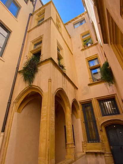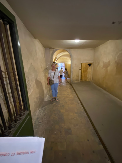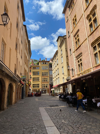 Einige Gruppen treffen wir im Alten Lyon wieder. Wir streifen durch die historischen Gassen. Gezielt suchen wir nach den "traboules", Gänge durch die Hinterhöfe, die uns zu den Geheimnissen früherer Bauweisen führen und uns wunderbare Einblicke in das Alte Lyon geben. Auch die Schüler sind mit Fragebögen ausgestattet und betreten sehr diszipliniert die Arcaden. Für die heutigen Bewohner sind es ganz normale Flure und Durchgänge. Bei aller Neugier der Schauenden wollen sie natürlich nicht gestört werden. Längst nicht alle Zugänge sind offen, aber was wir sehen, ist sehr imposant. Die Arcaden, Brunnen und Spiraltreppentürme zeigen sich in typischen mediterranen Farben. Auf einem Platz erzählt eine Lehrerin theatralisch offenbar eine Geschichte aus alter Zeit und die Kinder lauschen fasziniert. Die Cathédrale St. Jean besichtigen wir nur von außen. In den gepflasterten Straßen gibt es überall Restaurants. Auch wir gönnen uns eine Mittagspause und essen in einem vernünftig klimatisierten Restaurant ein kleines Menü. Gestärkt verlassen wir das Vieux-Lyon.