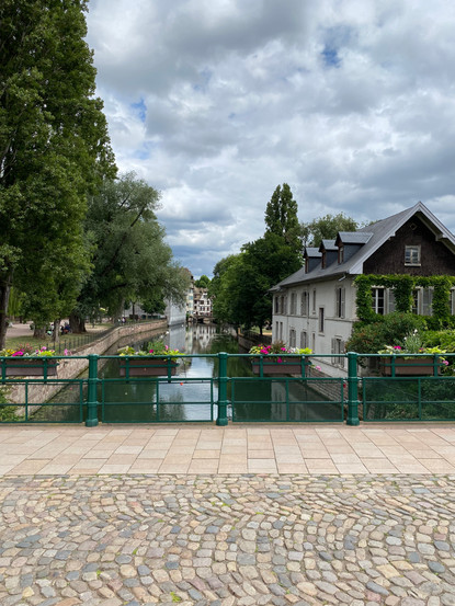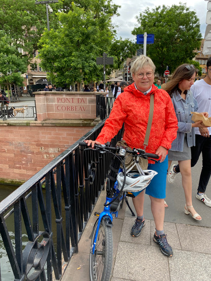 Straßburg war voller Menschen und wir schieben die Räder durch die Stadt. Ziemlich zielgenau landen wir als erstes am Straßburger Münster. Von mindestens 1647 bis 1874 war das Münster mit seinem 142 Meter hohen Nordturm das höchste Bauwerk der Menschheit. Wir bummeln kilometerweit immer wieder an altem Fachwerk vorbei, passieren historische Brücken, vorbei an voll besetzten Restaurants und Cafés. Langsam bekommen auch wir Appetit und finden uns in einem Restaurant mit typisch Elsässischer Küche ein. Frank ißt in der „Winstub Le Clou“ Reibekuchen mit Sauerkraut und Meerrettich im Stück geschmort und ich genieße Le Baeckeoffe mit Salade Verte. Baeckeoffe besteht traditionell aus drei Sorten Schmorfleisch: Schwein, Rind und Lamm und wird mit Gemüse in Keramikterrinen im Ofen gegart. Früher wurde das Gericht häufig an Waschtagen gegessen, da man es abends zuvor vorbereiten konnte und später nur noch aus dem warmen Ofen nehmen konnte. Neben uns im Le Clou sitzt ein älterer Herr, mit dem wir ins Gespräch kommen. Er ermahnt Frank, der von meinem Teller nascht, dass das keinesfalls der Etikette entspricht. Wenn die Frau beim Mann nascht sei das o.k., aber nicht umgekehrt. Es ist immer wieder schön zu erleben, wie die Franzosen, hier die Elsässer und deren Gäste, Essen zelebrieren. Auch wir sind danach gestärkt und zufrieden und setzen unseren Rundgang im Stadtteil La PetiteFrance fort. Das ist das alte Gewerbeviertel von Straßburg.