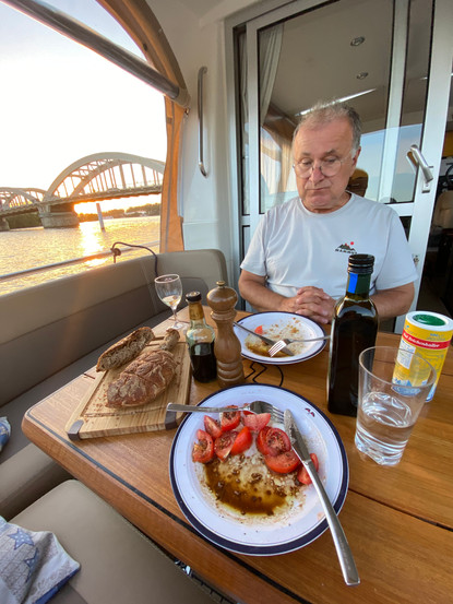 Bevor wir nach Lyon fahren, bewegen wir uns noch mal wenige Kilometer weiter nach Neuville-sur-Saône. Wir wollen von Lyon aus für einige Tage nach Hause fahren und müssen möglichst zeitnah zum Abflugtermin in Lyon ankommen, da man eigentlich im Hafen von Confluence nur 4 Tage bleiben darf. In Neuville-sur Saône gibt es wieder einen kostenfreien kommunalen Anleger. Dieser befindet sich an einem Betonkai, an dem wir an Ringen festmachen. Es gibt sogar Strom oberhalb der Ufertreppen. Unsere Strippe reicht gerade so, indem wir das Boot noch etwas besser ausrichten. Auf Grund der Lage der Festmacher müssen wir mit recht langen Leinen arbeiten. Frank gibt keine Ruhe und wir schauen uns trotz 39 Grad noch mal unser Bugstrahlruder an. Dazu schließen wir alle Fenster und Türen und machen die Klimaanlage an. Dann geht es ans Ausräumen. Der Motor befindet sich im Bug unterhalb unserer Betten und dort unterhalb unserer großen Staufläche. Also heißt das, Betten und Matratzen raus. Ein Teil der Klamotten raus und dann ist der Motor freigelegt. Franks Ahnung hat sich bestätigt. An der Verkleidung des Motors für das Bugstrahlruder befindet sich ein Ersatzscherstift. Damit brauchen wir nicht die Lieferung nach Berlin abwarten und machen uns mit Hilfe des Videos daran, den Motor zu demontieren. Leider fehlt uns ein winkliger Imbusschlüssel, so dass sich die Verschraubung des Motors nur etwas umständlich lösen lässt. Der Motor liegt schräg auf, so dass wir uns mit einer Halteschlaufe behelfen, um nicht zu verkanten. Tatsächlich finden wir den in 3 Teile gebrochenen Scherstift und können die Reparatur vornehmen. Nach 1,5 Stunden schweißtreibender Arbeit ist es geschafft. Frank ist stolz. Wir freuen uns sehr, wieder ein einsatzfähiges Bugstrahlruder zu haben. Zwar kann man natürlich auch ohne fahren, aber die Sicherheit, eine Bugstrahlunterstützung zu haben, ist beruhigend. Während wir gebaut haben, hat sich unser Boot 2-mal extrem aufgeschaukelt. Wir haben es dann strammer festgemacht und noch Fender an der Reling ergänzt. Das Phänomen haben wir uns inzwischen erklären lassen. Man nennt es "Grundwelle" In unserem Fall ist die Welle gegen den Betonkai gelaufen und konnte dort nicht weg. So wurde sie zurückgeschlagen, was zum Aufschaukeln des Bootes geführt hat. Es sollen auf diese Art und Weise schon Boote gekentert sein. Wir haben "nur" einen Kratzer an der Reling davongetragen, den wir hoffentlich wieder wegpolieren können.