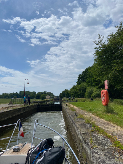 Donnerstag sind wir auch wieder für 9:00 Uhr zum Schleusenstart verabredet. Die Begleitung wechselt bei Dannemarie. Hier legen wir eine Mittagspause gegenüber dem Hafen ein. Ich koche uns ein paar Nudeln, so dass wir gestärkt in den folgenden Abschnitt gehen. Und der hat es in sich. Nachdem wir heute schon 13 Schleusen hinter uns haben, sind nun noch 15 zu bewältigen. Dabei eine Schleusentreppe mit 7 Schleusen. Das heißt, wir verlassen die eine Schleuse und fahren in die nächste ein. Der Hub ist zwischen 2,60 und 3,00 Metern. Ich muss die Schleusenleine alleine über die Festmacher bugsieren. Man könnte eine Treppe Steuerbord am Bergtor erklimmen oder Backbord Nähe dem Taltor. Das ist eine ziemlich aufwendige und dreckige Angelegenheit. Die Zusammensetzung des Kanalwassers möchten wir lieber nicht kennen. Zum einen ist der Kanal sehr verkrautet und führt offenbar zum anderen diverse Abwässer. Daher nehme ich die Leine vorne auf den Enterhaken, stelle mich auf das Dach unserer Schlafkabine und jongliere die Leine. Frank fährt zielgenau auf Höhe des jeweiligen Festmachers und schiebt das Boot dann Richtung Schleusenwand.