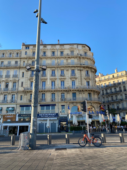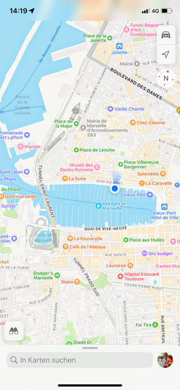 Wir bleiben eine gute Stunde und machen uns dann erfrischt auf den Weg nach Marseille. Uns begleitet eine Windstärke 3 bis 4. Immer näher kommt die Stadt und wir passieren die Hafeneinfahrt. Ein absolut gigantisches Gefühl. Vor lauter Staunen verpassen wir beinahe den Richtungswechsel nach steuerbord zum Vieux Port. Frank meldet sich in etwas holprigem Englisch bei der Capitainerie. Die versteht nicht recht und dann kommt vom Hafenkapitän: "Was willst Du“. Das verleitet Frank beinahe dazu in Russisch zu antworten. Wir sollen zur Capitainerie am Beginn des Hafens kommen. Dort sehen wir keine Liegemöglichkeit. Gerade als wir uns noch mal melden wollen kommt ein Schlauchboot: „Follow me“ sagt der Bootsführer. Wir müssen wenden und höllisch aufpassen, denn von allen Seiten kommen Boote, große, kleine, Ausflugsschiffe, Segler usw. Als wir wieder auf Kurs sind rast das Schlauchboot durch den Hafen und wir müssen zusehen, dass wir dranbleiben. Wir bekommen einen Platz zugewiesen, wo wir längsseits am Steg anlegen sollen. Der Hafenmeister entschuldigt sich für den Platz, einen anderen hat er nicht. Bis dahin verstehen wir noch nicht, was an dem Platz suboptimal sein soll. Nachdem Frank von der Anmeldung, zu der er mit dem Schlauchboot mitgefahren ist, zurück ist, müssen wir noch mal umsetzen und nachdem wir gerade unseren Anleger getrunken haben, noch ein mal. Wir liegen an der Westseite des Hafens genau gegenüber dem Rathaus. Regelmäßig fährt von diesem Steg ein riesiger Katamaran mit Gästen hinaus aufs Meer. Gleichfalls ein größerer Segler. Das mach den Steg natürlich unruhig. Wir verstehen nun. Damit können wir gut leben. Mit wenigen Schritten sind wir auf der Hafenpromenade. Dort beginnen bereits die Vorbereitungen für den französischen Nationalfeiertag. Zunächst befreien auch wir unser Boot vom Salzwasser. Unsere Schlauchspritze lässt sich nicht gut einstellen, so dass die Angelegenheit zum Vollduschbad wird. Da schieben wir das Duschen außer Bords gleich hinterher. Obwohl wir für die Sanitäreinrichtungen bezahlt haben, ist der Weg nicht zumutbar. Wir müssten zuerst das Hafenbecken mit der Fähre überqueren und dann noch lange bis zur Capitainerie laufen. Kann man machen, muss man aber nicht. Abends gehen wir Muscheln essen. Inklusive Wein und einem Dessert für 45 Euro, da kann man nicht meckern. Natürlich dürfen wir den Promenadenlärm genießen und früh die Straßenreinigung sowie die weiteren Vorbereitungsarbeiten zum Nationalfeiertag. Dennoch schlafen wir ganz gut.