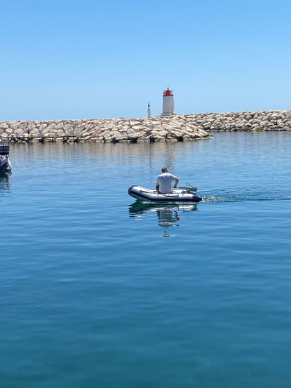 Unser Abendessen ist lecker. Es gibt gegrillte Dorade. Die Stimmung in den Restaurants ist gut und es macht Spaß, in diesem quirligen Treiben dabei zu sein. Auf dem Hafenvorplatz groovt sich eine Band ein. Wir hören eine Weile der Vorband zu. Zurück an Bord genießen wir eine Flasche Wein aus der Savoire, die uns Karin und Gerard mitgebracht haben, mit unseren belgischen Nachbarn. Beide sind Sprachlehrer Englisch und Deutsch und bezeichnen sich als Europäer. Er war vor der Wende mit seinen Studenten in Westberlin und von dort auch über den Checkpoint-Charlie in den Osten gereist. Wir verbringen einen ausgesprochen interessanten Abend, an dem wir auch die aktuelle weltpolitische Lage besprechen. Die Belgier reisen am Sonntag ab, vielleicht ihre letzte Reise mit dem Segelboot? Sie sind hier seit vielen Jahren im Revier. Aber die Frau ist schwer herzkrank und die Angst fährt bei jedem Turn etwas mit. Sie weiß, dass es für Ihn das Ein und Alles ist. Wir drücken Beiden beide Daumen für viel Gesundheit und einen glücklichen gemeinsamen Lebensabend. Auch die deutschen Segler reisen am Sonntag wieder ab. Wir haben einige Tipps für schöne Häfen in unseren Karten gekennzeichnet. Der Sonntag ist nicht so turbulent, wie der Samstag in Sausset-les-Pins. Zwar hören wir den Rummelplatz mit den Rufen der Budenbesitzer und den Spaß der Kinder, aber ansonsten läuft alles ruhig ab. Die Taucher machen sich in Gruppen auf zu ihren Revieren. Aber das ist ein kurzes Ankommen und Gehen. Wir bauen unser Schlauchboot auf. Bei der Hitze eine schweißtreibende Angelegenheit. Ich kann Frank überzeugen, das Boot auch zu wassern und den Motor nebst Akku anzubringen. Es ist etwas mühselig aber es klappt. Wir drehen ein paar Runden im Hafen. Unser Gestell zur Halterung wird nun auch angebracht. Allerdings können wir die Flügelschrauben nirgends finden. Es müssen Kabelbinder herhalten. Das Schlauchboot nimmt nun seinen Platz für die Zeit im Mittelmeer ein. Auch wenn alles gut bedacht ist, ist die Heckleine backbord nicht so einfach zu bedienen. Ich leg sie mir später schon mal um das Boot herum, um nicht zu riskieren, beim Anlegemanöver baden zu gehen. Hierfür bringen wir auch noch eine Halteleine an. So sollte es klappen. Die Praxis wird es zeigen.
