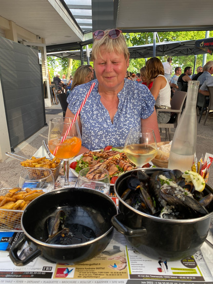 Am Mittwoch geht es weiter Richtung Tournus. Wir legen unterhalb der Brücke von Tournous am städtischen Kai an. Ein Schild fordert uns auf, uns im Office de Tourisme zu melden und unser Entgelt zu entrichten. Wir machen zunächst eine Pause, denn die Mittagshitze mit mehr als 30 Grad macht uns zu schaffen. Mir rinnt der Schweiß in Strömen, als wenn das getrunkene Wasser gleich durchläuft. An diese Temperaturen müssen wir uns erst gewöhnen. Da es nicht abkühlt, bevor es Nacht wird, machen wir uns dann doch auf den Weg, um die Stadt zu erkunden. Die Touristinformation liegt Nahe der Klosterkirche St. Philbert aus dem 11. Jahrhundert. Die nette Dame in der Information erklärt uns, dass am Abend oder vielleicht auch am kommenden Morgen ein städtischer Beamter kassieren kommen wird. Das Gelände um die Klosterkirche birgt ein historisches Ensemble, welches wir bis auf die Kirche von außen in Augenschein nehmen. Bei der Kirche stellen zeitgenössische Künstler aus der Region ihre Werke aus. Wir treffen auch die Bootsfahrer von der Linsen wieder, die ebenfalls die Stadt erkunden und genauso unter der Hitze stöhnen wie wir. Lösungsansatz - von einem Café zum nächsten hangeln. Uns gefällt Tournus nicht ganz so gut. Die Stadthäuser aus der ersten Hälfte des 16. Jahrhunderts und die großen Villen entdecken wir, müssen aber den Beschreibungen unseres Prospektes glauben, was das Innere betrifft. Hier wären wir neugierig gewesen, doch wir entdecken keinen Zugang. Insgesamt wirkt die Stadt deutlich ärmer als Chalon-sur-Saône. Offensichtlich gibt es auch einigen Investitionsstau. Auch die versprochenen Restaurants sind geschlossen oder nicht da. Zum Abendessen landen wir in einer Eckkneipe am Markt, welche neben den Sternerestaurants, die einzige offene Kneipe zu sein scheint. Es gibt ein einziges Gericht, was aber o.k. ist. Wir bekommen ein Platte mit regionalen und italienischen Wurst- und Käsestücken, Oliven und sauren Gurken. Uns fällt auch heute wieder auf, dass in Frankreich sehr viel geraucht wird. Auch in dieser Kneipe wird wieder mehr Bier als Wein getrunken. Zurück auf unserem Boot trifft uns eine Hitzewolke. Nachdem wir Durchzug gemacht haben, können wir irgendwann auch schlafen. Da wir um 9:00 Uhr am nächsten Morgen bereits losfahren, hat es der städtische Beamte nicht mehr geschafft, uns abzukassieren.