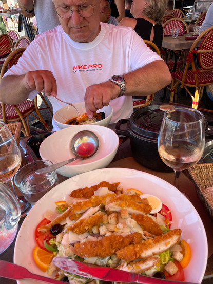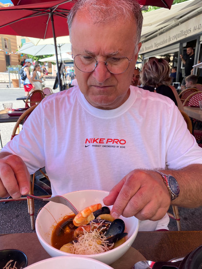 Am Mittwoch verlassen wir Marseille. Frank fährt mit der Fähre zur anderen Hafenseite und von dort per Pedes zur Capitainerie um unseren Hafenschlüssel abzugeben. In der Zwischenzeit ist der Hafenmeister bei uns am Boot und fragt, ob wir heute abreisen. Ja, machen wir. Ich fülle noch Wasser auf und nehme beim Entfernen des Schlauches wieder mal eine unfreiwillige Dusche. Die Ausfahrt aus dem Hafen ist ebenso spektakulär, wie die Einfahrt. Um die Zeit fahren diverse Boote mit uns hinaus und wir sind froh, als wir aus dem Knäul heraus sind. Obwohl nur eine Windstärke 3 herrscht, ist der Wellengang erheblich. Kurze Wellen, häufig über 1 Meter treffen uns von vorn, so dass wir die Scheibenwischer einsetzen müssen und regelmäßig in das Wellental knallen. Wir umfahren die Île Tiboulin und die Île Maire und dann geht es weiter in Richtung Süd-Ost entlang der Calanques, einer Fjordlandschaft, die sich bis Cassis zieht. In den größeren Calanques ist ankern erlaubt. Wir versuchen es auch. Der mögliche Ankerbereich ist durch gelbe Tonnen zum Ufer abgegrenzt, so dass die Badebereiche frei bleiben. In der Calanque liegen schon einige Boote vor Anker. Wir lassen den Anker raus. Aber der Wind vertreibt uns während des Herablassens des Ankers an die gelben Tonnen. Da schon einige Boote liegen, ist es uns zu eng, um noch mal einen Anlauf zu nehmen. Auch besteht die Gefahr, dass Strömung und Wind den Anker unters Boot in Richtung Welle treiben. Also geht es wieder heraus aus der Calanque und rein die Wellen. Wir wollen gerne im Port Miou festmachen. Das ist der einzige Hafen in einer Calanque, ca. 30 Minuten fußläufig vor Cassis. Wir waren ganz überrascht, als wir eine problemlose Zusage für einen Platz erhielten. Bei all dem Wind und den Wellen kamen uns in der Einfahrt Paddler und Standup-Paddler entgegen. Wir haben noch zu gut unseren Trip mit Moritz von Cassis in die Calanques mit einem Paddelboot vor ca. 11 Jahren in Erinnerung. Mal abgesehen davon, dass ich nicht geradeaus fahren kann und immer auf einer Seite stärker ziehe, waren wir nach der Tour fix und fertig. Wegen meines Unvermögens wollte Frank gerne alleine paddeln, so dass ich mit Moritz gefahren bin. Man saß jedoch auf den Booten so komisch obendrauf, dass wir gleich wieder gewechselt haben. Als wir zurück am Strand von Cassis waren, haben Frank beinahe die Beine versagt vor Anstrengung. Als wir im Port Miou ankommen, erkennen wir nicht, wo wir festmachen können. Auf beiden Seiten entlang der Schlucht liegen Boote. Wir rufen noch mal den Hafenmeister an. Wieder in einem Mix aus Französisch und englisch verständigen wir uns und dann sehen wir den Hafenmeister. Er bedeutet uns, dass er uns mit einem Begleitboot zu einem Platz bringt und wir müssen wenden. Es dauert einen Moment, bis wir kapieren, dass wir vorwärts anlegen müssen. Es gibt Mooringketten für vorne und hinten. Die hintere Kette klemmt und löst sich auch nicht nach größter Motoranstrengung, die der Hafenmeister mit seinem Boot unternimmt. Wir sollen dann hinten an einer Mooringboje festmachen. Die Capitainerie und die Sanitäranlagen befinden sich auf dem gegenüberliegenden Ufer. Dorthin müssen wir mit unserem Schlauchboot übersetzen. Gut, dass wir das schon mal vorbereitet und kurz geübt haben. Der Hafenmeister nimmt unsere Papiere. Bezahlen können wir, wenn wir uns entscheiden abzureisen. Wir erwägen vielleicht sogar 3 Nächte zu bleiben. Am westlichen Ufer ragen steile Felswände empor. Auf unserer Seite geht es steil hinauf in den Ort und weiter nach Cassis. Das tolle ist, das Wasser in der Calanque ist so sauber, dass wir vom Boot aus Baden können. Das nutzen wir weidlich. Strom gibt es nicht, aber an dem klapprigen Steg gibt es eine Wasserleitung, so dass wir uns mit dem Schlauch nach dem Baden abduschen können und auch das Boot wieder von der dicken Salzschicht befreien können. Die Nacht ist im Vergleich zu Marseille herrlich ruhig. Am Donnerstag zum Nationalfeiertag der Franzosen machen wir uns am späten Vormittag auf nach Cassis. Es ist wieder brüllend heiß, viele Autos suchen in dem Vorort von Cassis einen Parkplatz, um in die Calanques zu gehen und zu baden. Auch aus Cassis kommen uns eine ganze Reihe von Leuten entgegen, die den Weg in die Calanques suchen. Das Gesamtbild von Cassis ist noch in unserer Erinnerung. Wir versuchen zu rekapitulieren, an welchen Stellen wir bei unseren vorangegangenen Aufenthalten gewesen sind. Natürlich schauen wir auch noch mal nach der Kanuausleihe. Die beiden Strände sind voll und auch wir lassen es uns nicht nehmen, uns bei einem Bad zu erfrischen. Für diesen Fall habe ich in meiner Raumwundertasche alles dabei. Mittags lassen wir uns in einer der Restaurants am Hafen nieder und beobachten den Fischer, der seine Fische ausnimmt und an den Mann bringt. Es herrscht ein gemütliches Treiben. Wir essen ausgesprochen gut. Vorsorglich bestellen wir „nur“ einen Salat und ein Hauptgericht. Von dem Salat hätten gut 2 Mann satt werden können, denn entgegen unserer Erwartung ist der Cäsar-Salat mit viel Hähnchenbruststreifen bestückt. Als Hauptgericht nehmen wir einen Meeresfrüchtetopf in wunderbarer Fischbrühe. Wir essen dann doch den Salat nicht auf, sondern den Fisch. Einfach köstlich. Später machen wir noch einen Rundgang durch den Ort und kaufen für den nächsten Tag ein Brot - kein Baguette. Zurück im Hafen können wir uns zum Glück gut abkühlen. In der Nacht gegen 21:00 Uhr fahren einige Boote aus dem Hafen. Zunächst können wir das nicht einordnen. Und dann wissen wir Bescheid. Ca. 21:30 Uhr hören wir Kanonendonner und Feuerwerk zum Nationalfeiertag. In der Calanque kann man nichts sehen. Leider können wir nicht noch einen Tag bleiben. Es deutete sich schon an, unsere Verbraucherbatterien, die für die Kühlschränke und Pumpen zuständig sind, lassen nach. In der Nacht wache ich auf und merke an der WC-Spülung, dass diese nur noch schwach läuft. Es ist 3:00 Uhr u